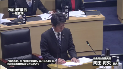 ◆向田将央議員 自民党議員団の向田将央です。一般質問をさせていただきますので、理事者の皆様におかれましては、明快な御答弁をよろしくお願いします。本日は、年収の壁や耐震改修の補助金などから考える松山市の広報戦略の在り方について取り上げたいと思います。
