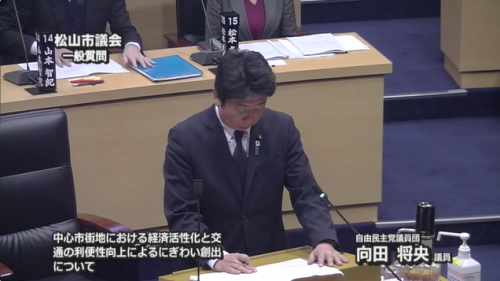 ◆向田将央議員 おはようございます。自民党議員団の向田将央です。一般質問をさせていただきますので、理事者の皆様におかれましては明快な御答弁をよろしくお願いします。今議会、松山市令和6年度当初予算の発表に併せて、関連事業として4つの柱を挙げられました。その3番目の柱に、経済の活性化と雇用環境の整備が上げられています。昨年11月、岸田内閣では、デフレ完全脱却のための総合経済対策との名称で、5つの具体的な経済対策を発表しました。この中でも特に着目されたのが、本年6月より実施めどの所得税、住民税の定額減税という施策ですが、この施策が公表された当初は、なぜ国民全体への給付ではなく減税なのかなどの批判の声を多く耳にしました。国税庁の統計によれば、安倍内閣発足以降、給与の支払いを受けている人数、いわゆる給与所得者数が、コロナ期のような例外や多少のばらつきこそあるものの、ほぼ全ての所得層で毎年前年を上回る統計結果が公表されています。また、長年上昇に転じることのなかった物価も、海外情勢を発端とする原油高が一因にこそなっているものの、政府が率先して旗振り役となり、原材料費の高騰のみに依存しない物価の上昇が実現されつつあります。政府から給付してもらって、ボーナス的な所得向上に頼るのではなく、国民が自らの労働によって得た所得から生活が豊かになるのを実感してもらうこと、受け取った賃金が消費へと向かい、これが企業の収益につながり、さらに企業の設備投資や従業員の賃金へと向かい、やがてはその先の松山市の経済が自立的に回転し続けることを期待しています。そんな思いから、今回の質問では、市長公約4つの柱の中から3つ目の柱、経済の活性化と雇用環境の整備、それと2つ目の柱、交通の利便性向上とまちの賑わい創出を中心に質問をさせていただきます。まずは、交通の利便性向上とまちの賑わい創出という市長公約の柱が提示されておりますが、最も大きな予算となっている事業として、市駅前広場整備事業が上げられています。令和3年12月議会で、私からもこの整備事業について質問をさせていただきましたし、私以外にもこの整備事業について質問をされたこともございます。ですので、重複する内容にもなるので、簡単にお伺いします。松山市では、この市駅前広場整備事業に対して、来年度当初予算で約20億円が計上されるわけですが、この事業の経済効果をどのように考えているのでしょうか。また、この市駅前広場整備事業を市長公約3番目の柱、経済活性化ではなく、2番目の柱、交通の利便性向上とまちの賑わい創出に位置づけていますが、市駅前広場整備事業は、経済活性化を期待して行われる事業ではないということでしょうか、松山市のお考えをお聞かせください。さらに、もう一つ、内容は少し変わるのですが、平成29年6月定例会におきまして、私から銀天街L字地区再開発についてお伺いしたことがあります。その後、銀天街L字地区湊町三丁目C街区地区再開発事業に関しての進捗状況についてもお聞かせください。